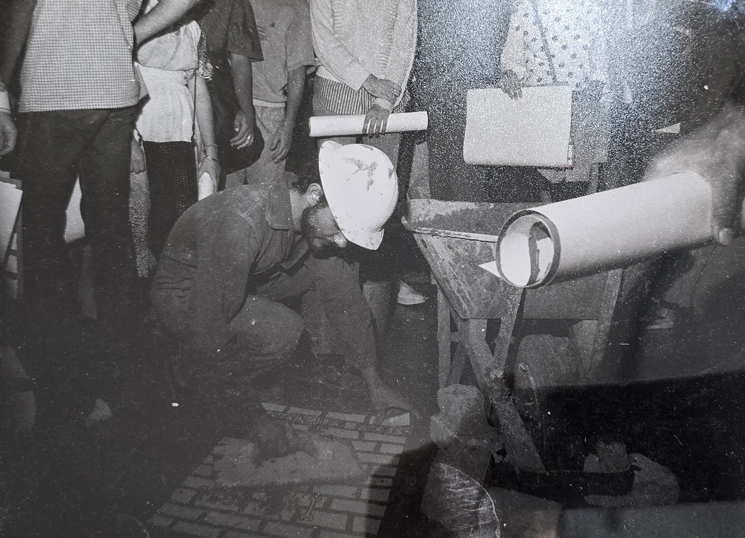 Documentation of a performance in which Cardenas igave out skeleton pieces to protest conditions in the country.