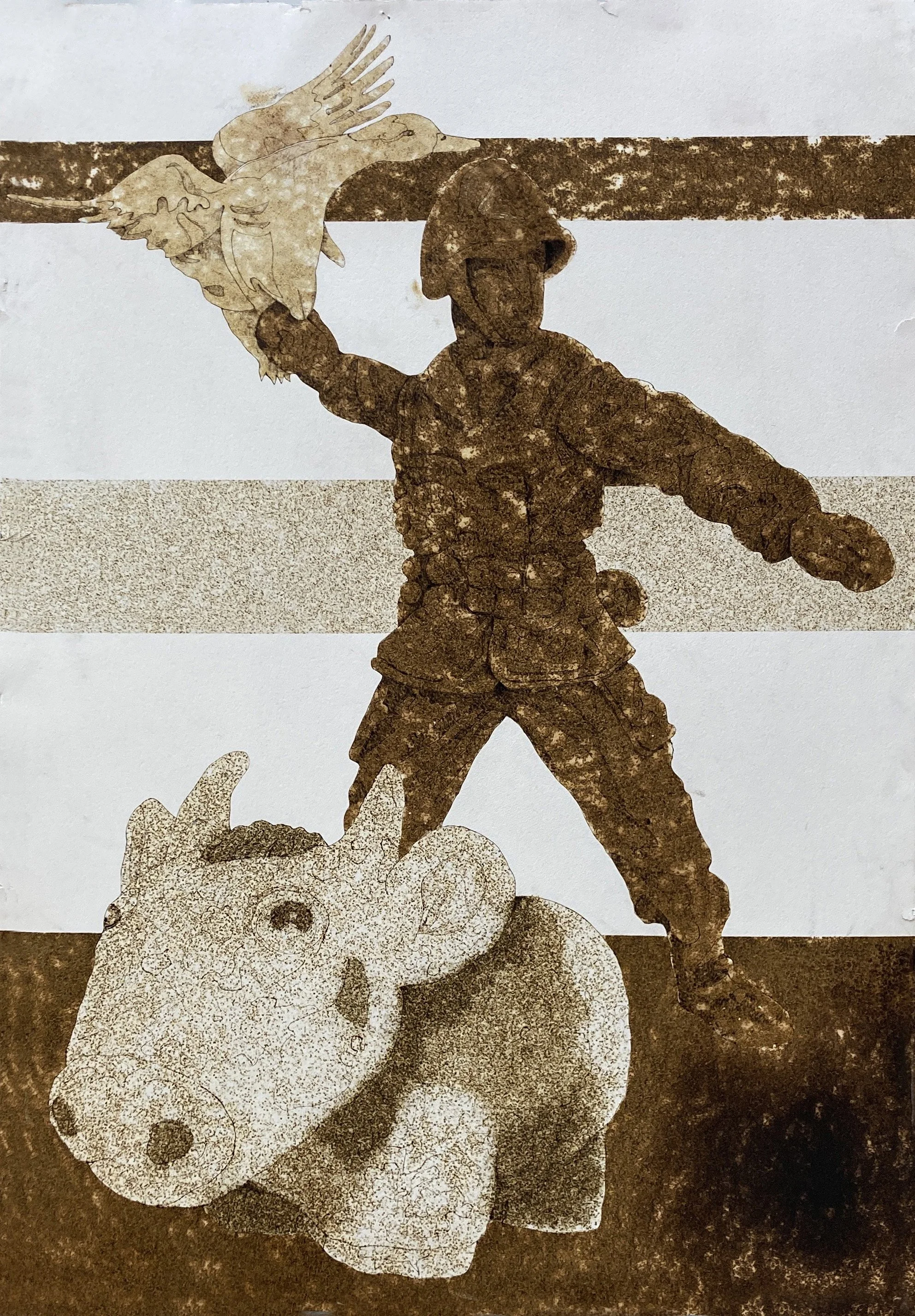 Pre-Raphaelite, William Holman Hunt’s “Our English Coasts (1852),” is a cautionary work that speaks of multiple breeds of straying sheep near an eroding English coast at the time of Napoleon III’s rise in France. Mark Runge’s own “Angels (2022)” echoes similar sentiments with his large cross shaped wooden crest-like painting depicting multi-colored ducks congregating on the lower depths of a what seems to be a turbulent landscape while the silhouette of a military plane closes in the distance.